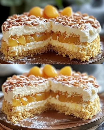 Spód ciasta: 2 duże jajka (w temperaturze pokojowej), 100 g cukru kryształu, 8 g cukru waniliowego, 50 ml oleju słonecznikowego, 50 g roztopionego masła, 340 g mąki pszennej, 10 g proszku do pieczenia, Nadzienie: 400 ml mleka pełnego, 10 g cukru waniliowego, 1 duże żółtko, 45 g cukru kryształu, 32 g mąki kukurydzianej, 200 ml śmietanki kremówki, 200 g pokrojonych w kostkę brzoskwiń w syropie, Dekoracja: 100 g płatków migdałowych, 30 g cukru pudru