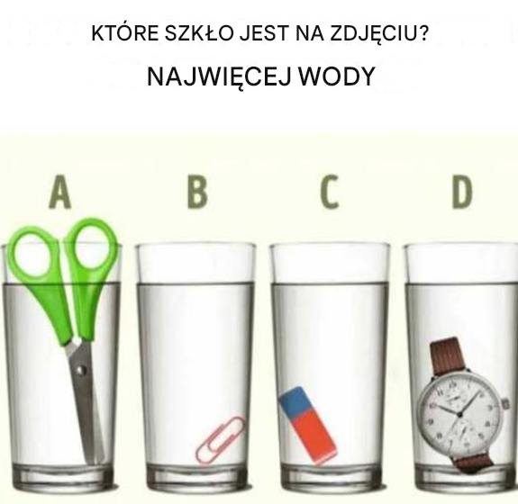 Rozwiązanie: Objętość wody zmniejsza się po umieszczeniu w niej przedmiotu, ponieważ woda zostaje wyparta. Im większy przedmiot, tym więcej wody wypiera, a tym mniej wody pozostaje w szklance.