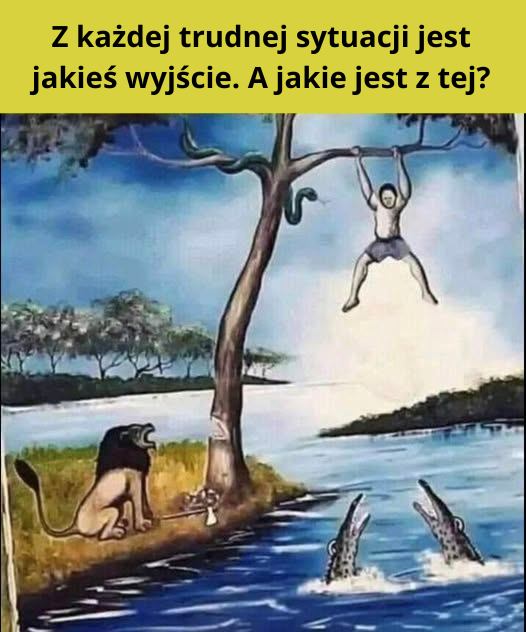 W tej zagadce mężczyzna jest otoczony przez zagrożenia, których pozornie nie da się uniknąć. Po jego prawej stronie znajduje się wąż, po lewej drzewo, które może zawalić się do wody, w której pływają krokodyle, a w pobliżu krąży lew...